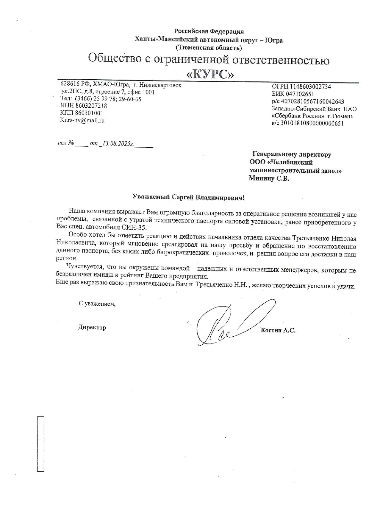 Директору ООО «ЧМЗ» Минину С.В.